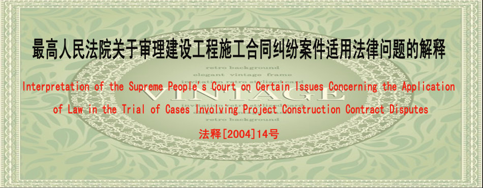 In accordance with the General Principles of the Civil Law of the People's Republic of China, the Contract Law of the People's Republic of China, the Biding Law of People's Republic of China, the Civil Procedure Law of the People's Republic of China, and the related laws and regulations, and based on the actual situation of the civil trial and adjudication, this Interpretation is formulated for issues concerning the application of law in the trial of cases involving project construction contract disputes.