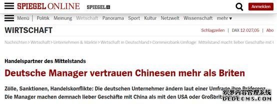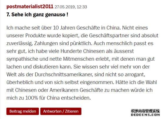 最后,在德國《明鏡》周刊的論壇上,許多留言者也對這一調查結果表示認同。一位稱自己在中國從商10年的網民就留言說,中國人對于世界的認知比美國人要好,也不像美國人那么傲慢和自我,確實是可靠的貿易伙伴。另一位網民則表示比起中國來說,美國確實對德國企業來說不太靠譜,總讓德國企業感到不舒服。